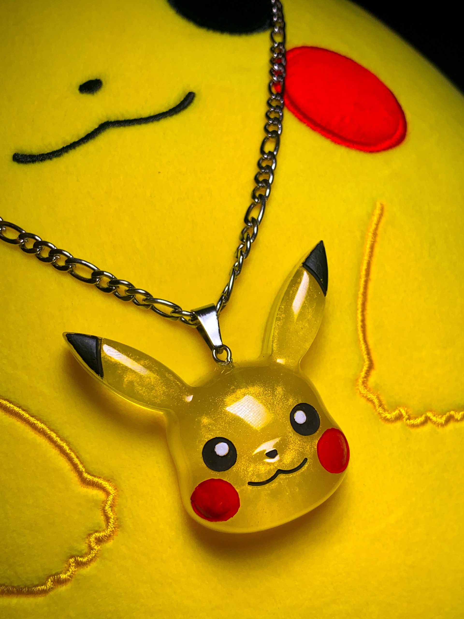 18″ silver figaro chain featuring a handmade resin pikachu pendant.