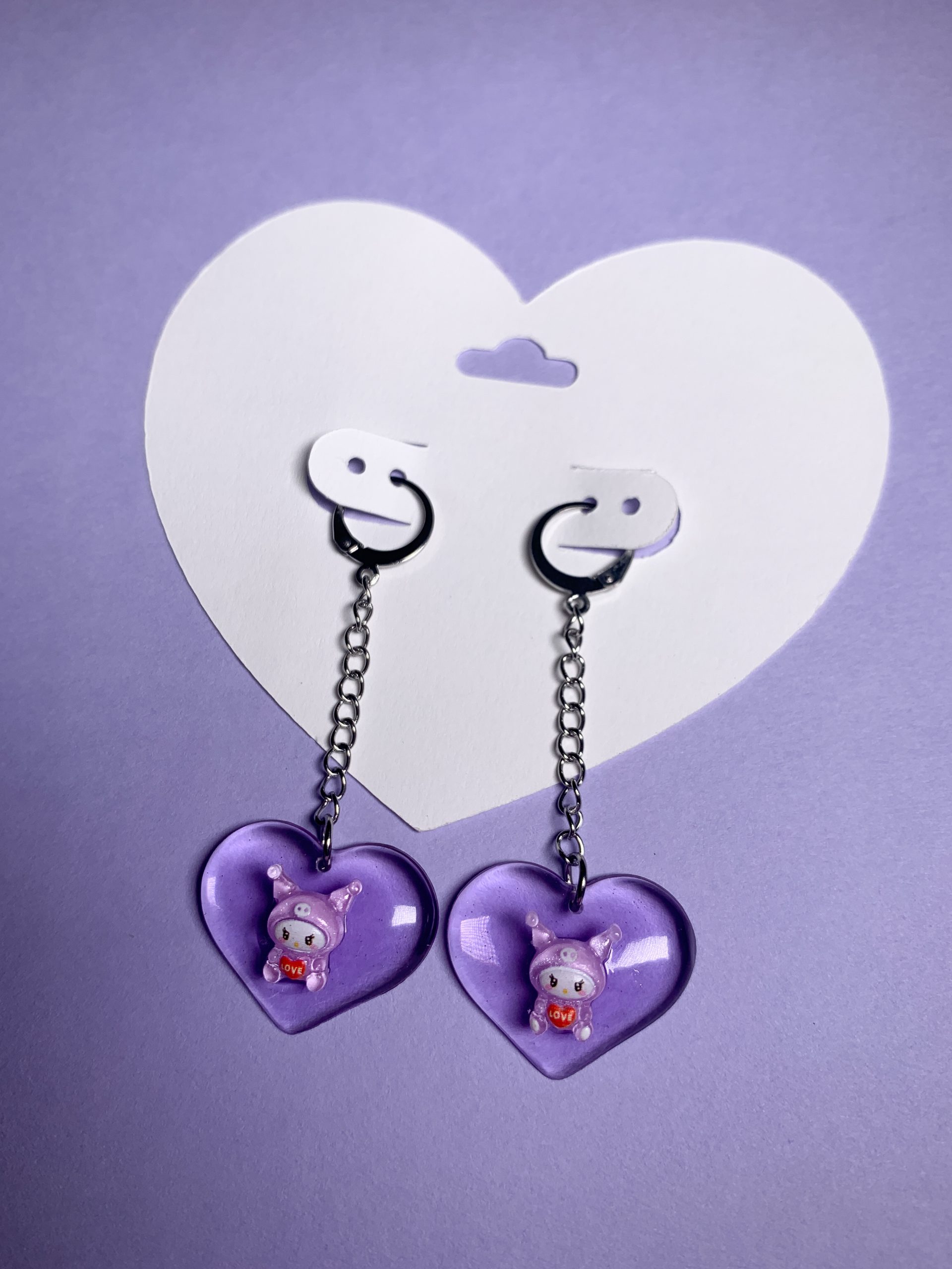 purple heart earrings, dangling from a chain & featuring purple kuromi charms.